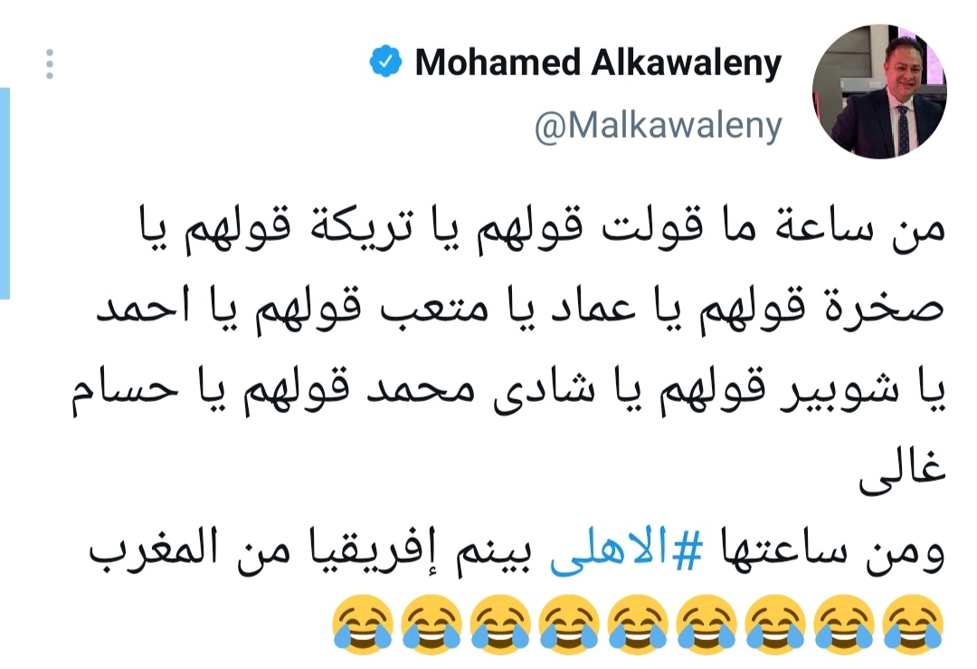 وأضاف: “من ساعة ما قولت قولهم يا تريكة قولهم يا صخرة قولهم يا عماد يا متعب قولهم يا أحمد يا شوبير قولهم يا شادى محمد قولهم يا حسام غالى ومن ساعتها الأهلي بينم إفريقيا من المغرب”.