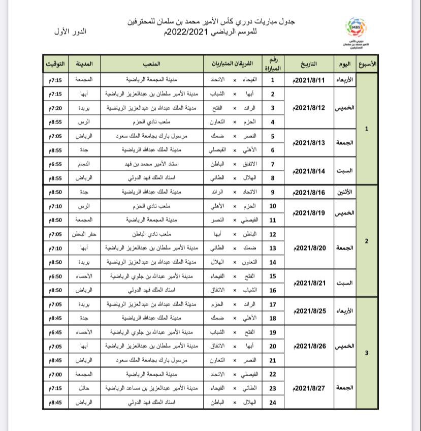 أعلنت لجنة المسابقات في الاتحاد السعودي لكرة القدم، عن جدول مباريات الدوري السعودي للمحترفين الموسم الجديد 2021-2022.