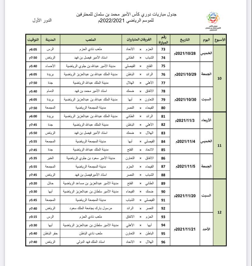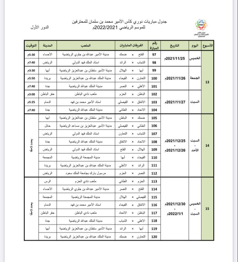 وأوضح الاتحاد السعودي أنه سيتم إعلان مواعيد مباريات الجولتين 14-15، خلال الأيام والمواعيد التي تم ذكرها في الجدول، بعد أن يتم الإعلان عن جدول مباريات كأس خادم الحرمين الشريفين 2021-2022.