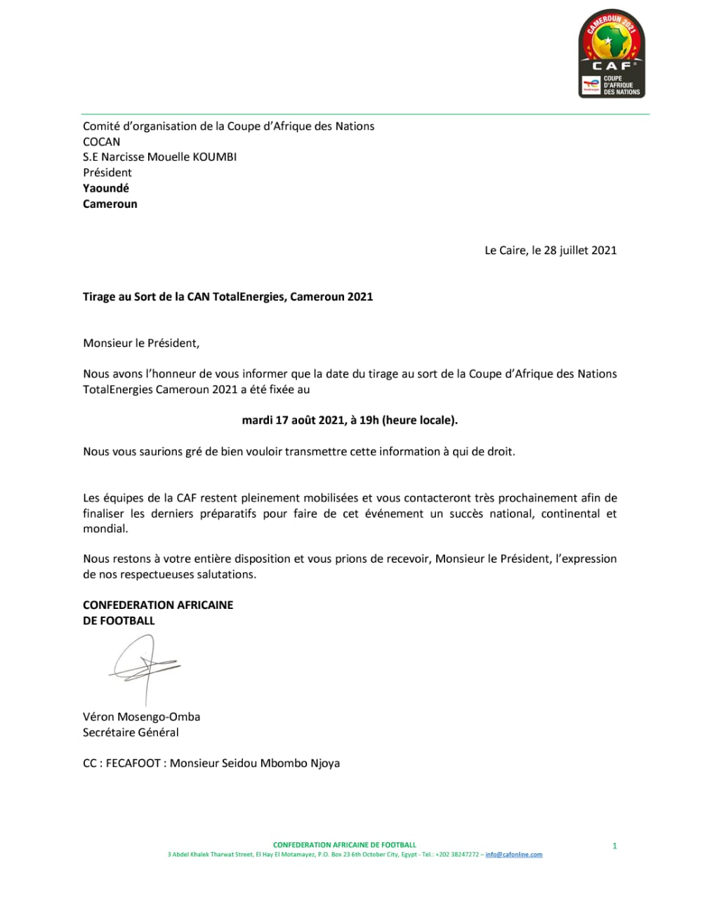 وقال الاتحاد الكاميروني أن قرعة بطولة أمم أفريقيا والتي ستنطلق بداية العام المقبل، ستقام يوم 17 أغسطس القادم في تمام السابعة مساءً.