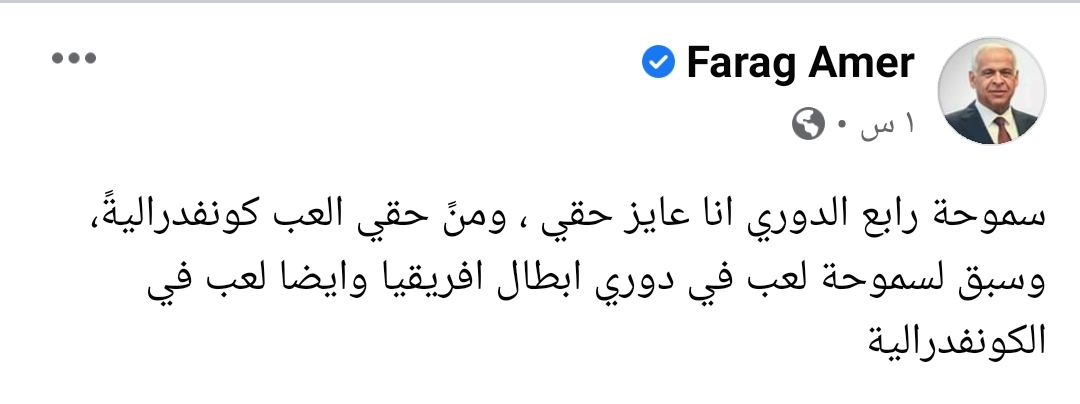 وكتب فرج عامر عبر صفحته بموقع التواصل الاجتماعي “فيسبوك”: “سموحة رابع الدوري انا عايز حقي، ومن حقي ألعب كونفدرالية، وسبق لسموحة لعب في دوري أبطال أفريقيا وأيضًا لعب في الكونفدرالية”