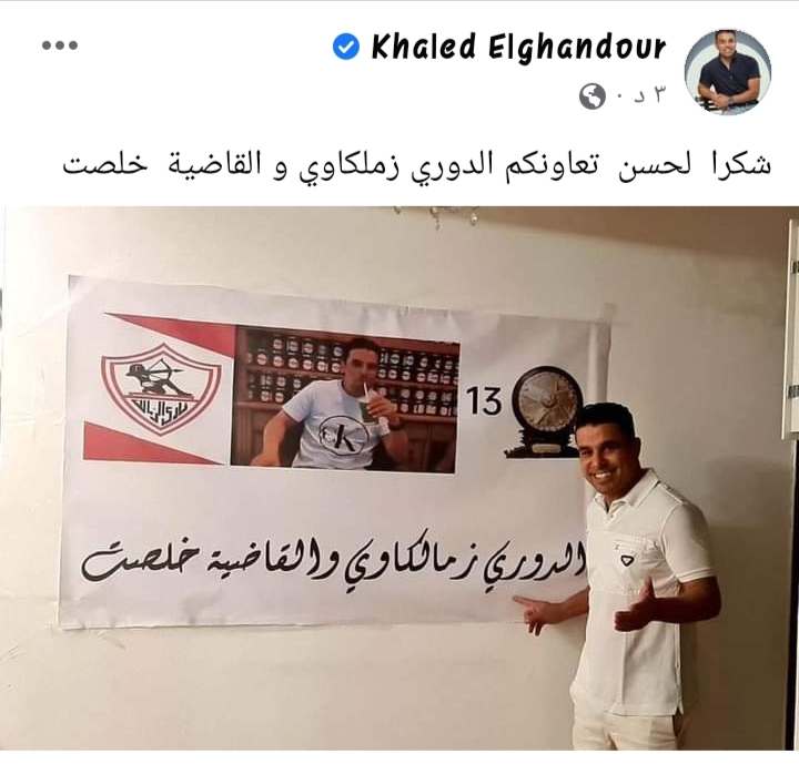 ونشر خالد الغندور، صورة عبر حسابه الرسمي على موقع التواصل الاجتماعي فيسبوك، فور حسم لقب الدوري المصري الممتاز لصالح الزمالك، والتي تحمل عنوان، “شكرا لحسن تعاونكم الدوري زملكاوي والقاضية خلصت”.