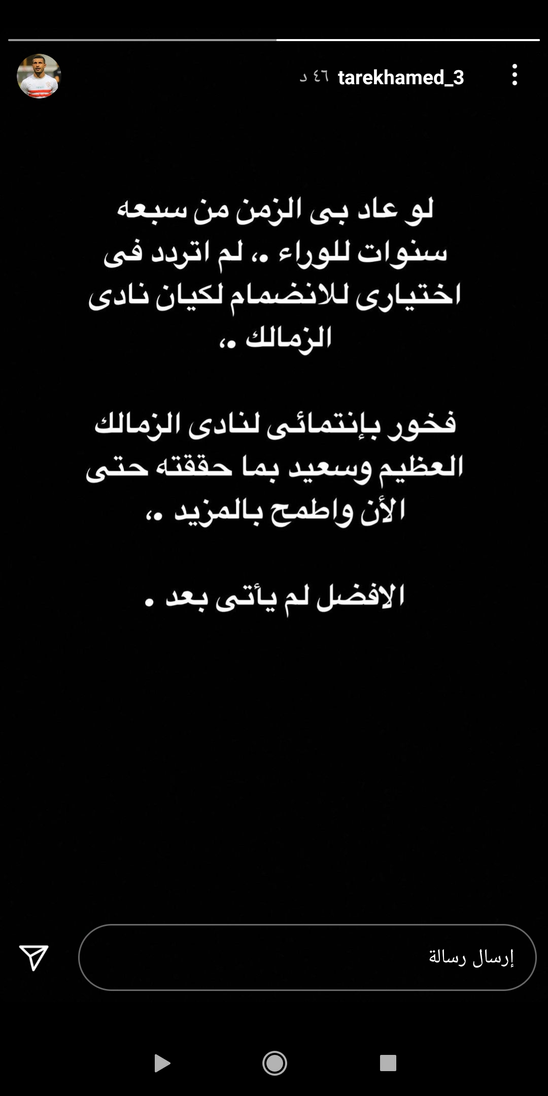 وكتب طارق حامد عبر الاستوري الخاص به على حسابه “انستجرام” : “لو عاد بي الزمن من سبعة سنوات للوراء، لم اتردد في الاختيار للانضمام لكيان نادي الزمالك”.