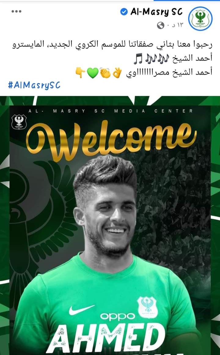 وكتب نادي المصري البورسعيدي، عبر حسابه الرسمي على موقع التواصل الاجتماعي فيسبوك، “رحبوا معنا بثاني صفقاتنا للموسم الكروي الجديد، المايسترو أحمد الشيخ، أحمد الشيخ مصراااااااوي”.