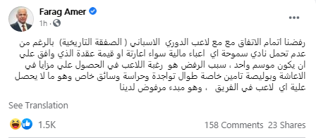 وكتب عامر اليوم الأحد عبر حسابه الرسمي بموقع التواصل الاجتماعي “فيس بوك”: “رفضنا إتمام الاتفاق مع مع لاعب الدوري الاسباني ( الصفقة التاريخية) بالرغم من عدم تحمل نادي سموحة أي أعباء مالية سواء إعارتة أو قيمة عقدة الذي وافق على أن يكون موسم واحد”.