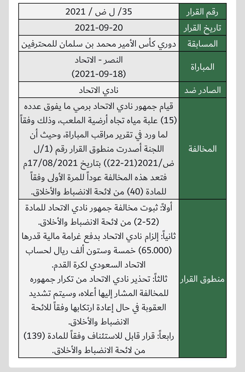 وأعلنت لجنة الانضباط والأخلاق في الاتحاد السعودي لكرة القدم، تغريم نادي اتحاد جدة، بقيمة 65 الف ريال بسبب رمي 15 قارورة مياه في ملعب المباراة التي جمعته بنظيره النصر، في الدوري السعودي.