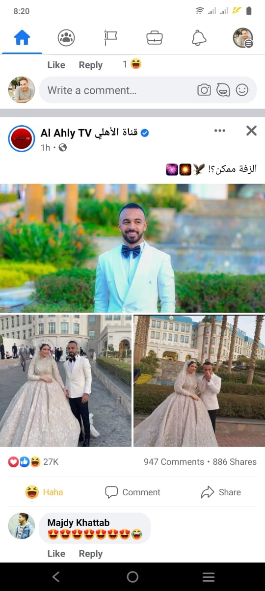 ونشر الحساب الرسمي لقناة النادي الأهلي الرسمية على موقع التواصل الاجتماعي فيسبوك، مجموعة صور لمحمد مجدي أفشة من حفل زفافه اليوم.