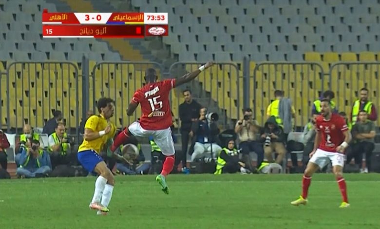 تعرض أليو ديانج لاعب وسط الفريق الأول لكرة القدم بالنادي الأهلي للطرد خلال مشاركته في مباراة فريقه أمام الإسماعيلي والمقامة حاليًا على ستاد برج العرب بمدينة الإسكندرية.