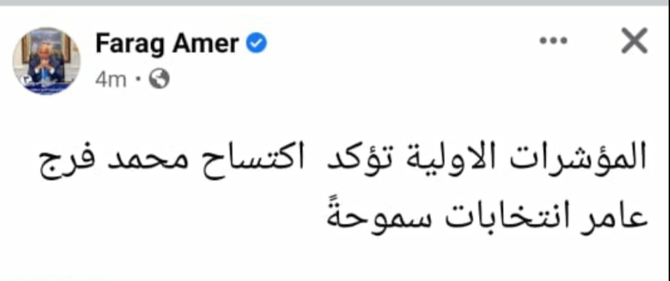 وكتب فرج عامر عبر حسابه الرسمي بموقع التواصل الاجتماعي “فيس بوك”: “المؤشرات الأولية تؤكد اكتساح محمد فرج عامر انتخابات سموحة”.