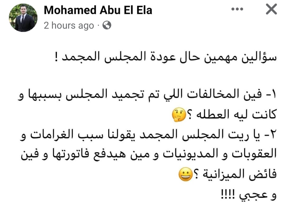 وأضاف: “ياريت المجلس المجمد يقولنا سبب الغرامات والعقوبات والمديونيات ومين هيدفع فاتورتها و فين فائض الميزانية؟.. وعجبي !!!!”.
