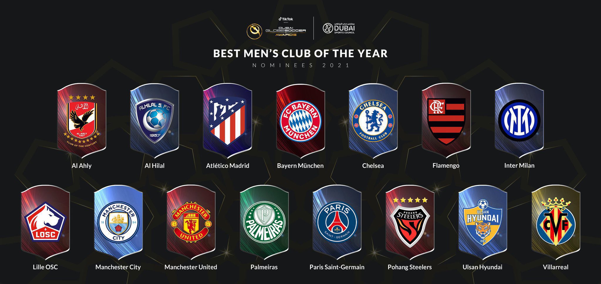 وتضم القائمة المرشحة لحصد جائزة أفضل نادي في عام 2021، إنتر ميلان الإيطالي، فلامنجو البرازيلي، تشيلسي، بايرن ميونيخ، الهلال السعودي، الأهلي، فياريال، أولسان هيونداي، بوهانج ستيليرز، باريس سان جيرمان، بالميراس البرازيلي، مانشستر يونايتد، مانشستر سيتي، ليل الفرنسي”.