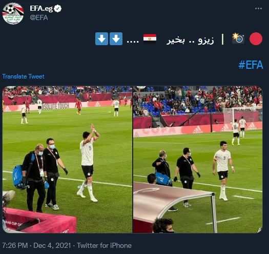 وطمأن الاتحاد المصري، الجمهور على حالة زيزو، حيث أوضح أن اللاعب بخير وبالتالي سيشارك في مباراة الجزائر المقبلة، ضمن منافسات الجولة الثالثة من بطولة كأس العرب.