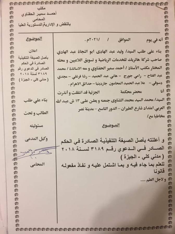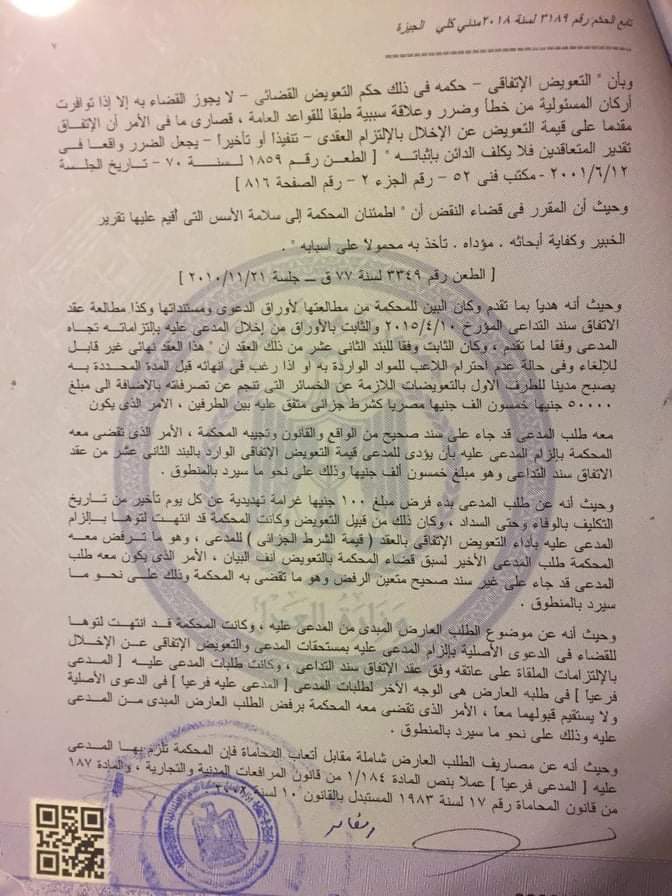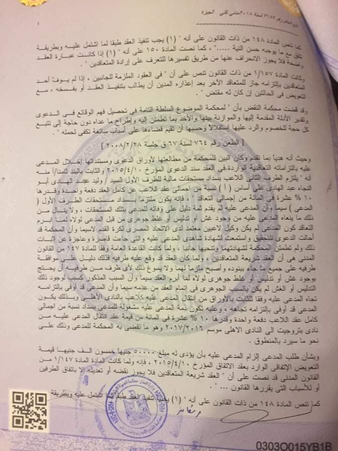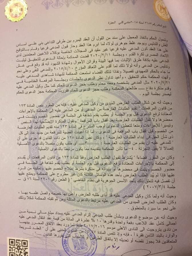 ومن جانبه كتب الإعلامي محمد فاروق عبر حسابه الرسمي على موقع التواصل الاجتماعي “فيسبوك”: “المحكمة تُلزم محمد الشناوى بدفع مليون و600 ألف جنيه إلى وليد عبد الهادي وكيله السابق قيمة الـ10% من قيمة انتقاله للأهلي”.