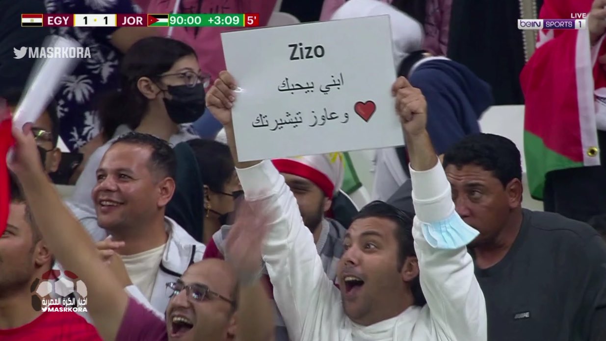 وطلب مشجع منتخب مصر من أحمد سيد زيزو الحصول علي القميص الخاص به، حيث كتب على اللافتة “إبني يحبك وعاوز تيشيرتك”.