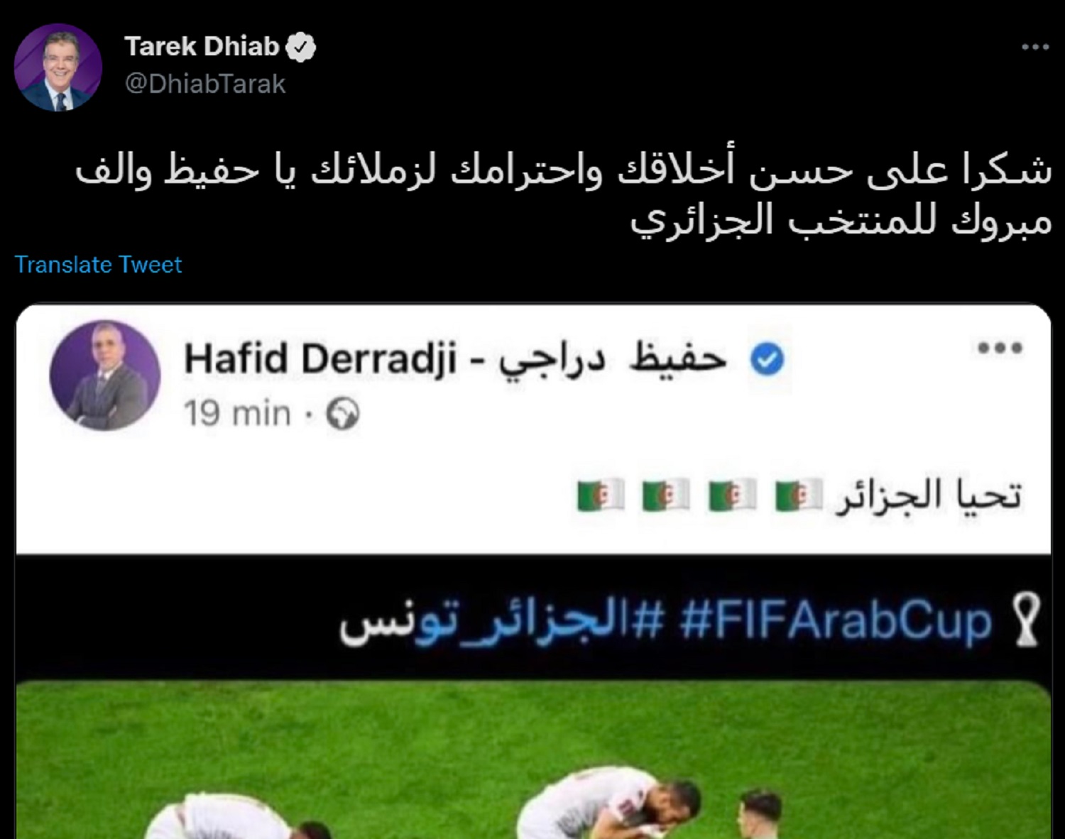 ونشبت ‏أزمة أخرى نشبت بين المحلل التونسي طارق دياب والمعلق الجزائري حفيظ دراجي، حيث رد دياب بمنشور استنكر من خلاله منشور دراجي وكتب دياب عبر تويتر: “شكرًا على حسن أخلاقك واحترامك لزملائك يا حفيظ وألف مبروك للمنتخب الجزائري”.