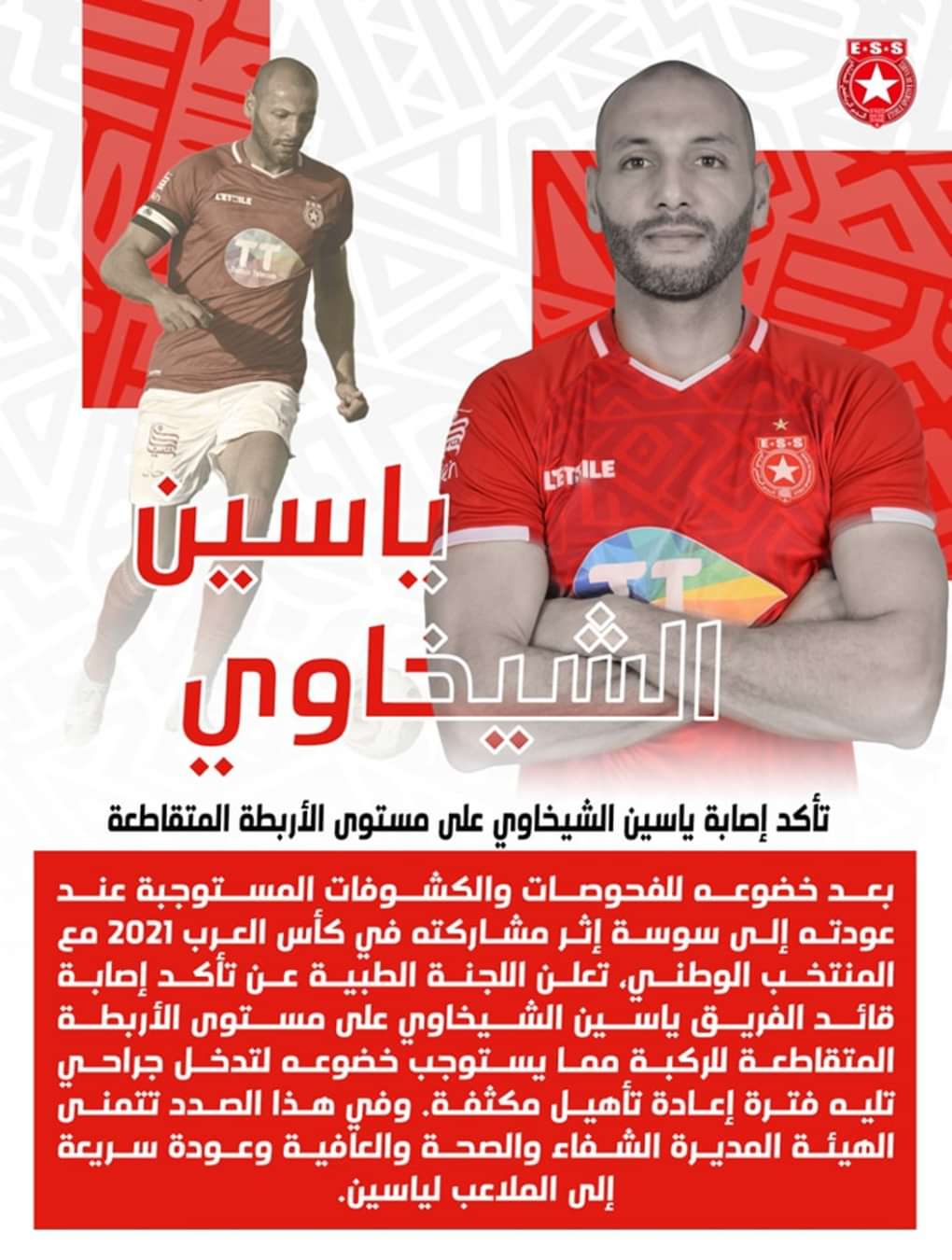 أعلن النجم الساحلي التونسي لكرة القدم اليوم السبت إصابة ياسين الشيخاوي لاعب الفريق الكروي الأول ومنتخب تونس بقطع في الرباط الصليبي.