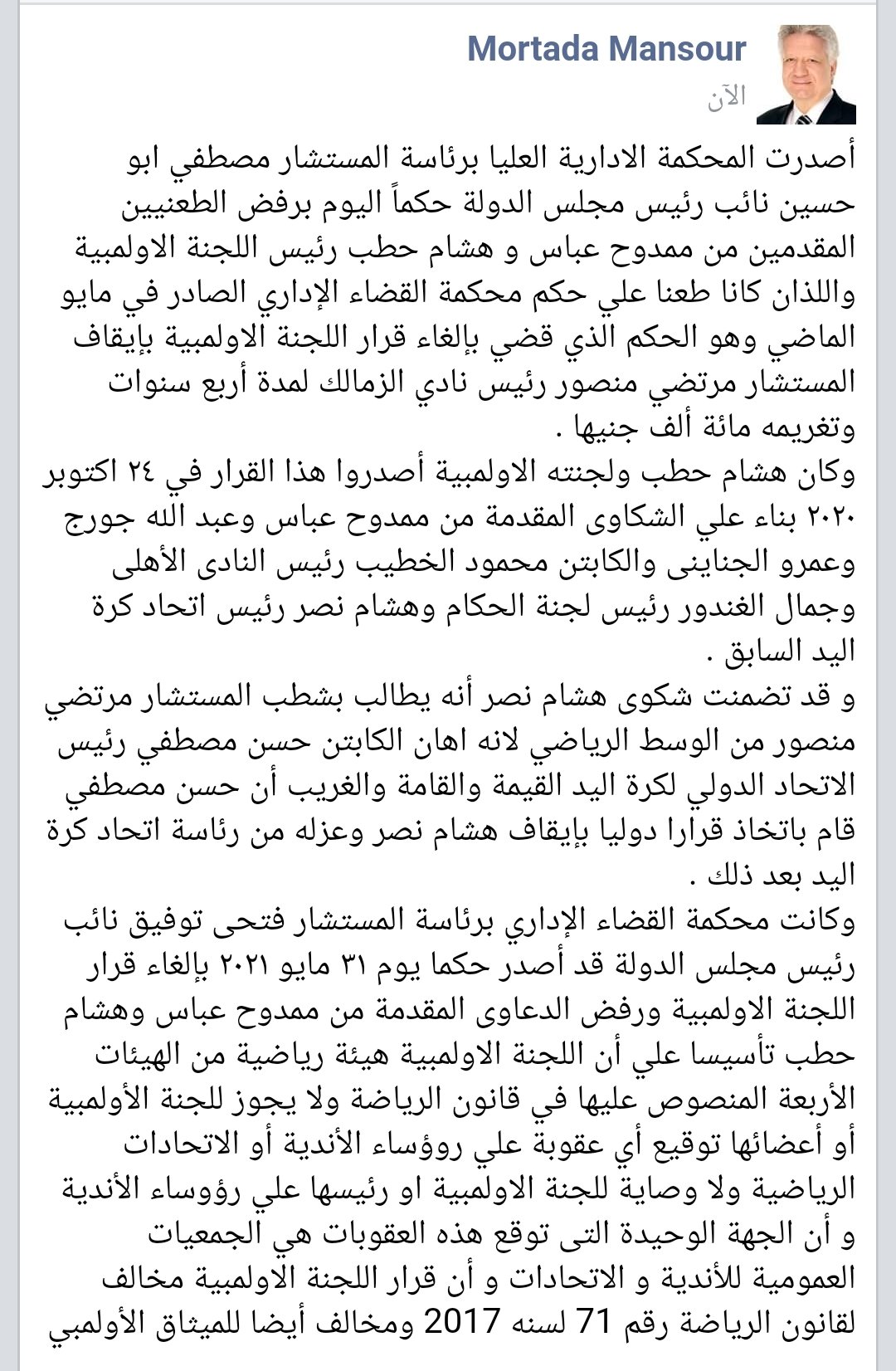وأكمل: “وكانت محكمة القضاء الإداري برئاسة المستشار فتحي توفيق نائب رئيس مجلس الدولة قد أصدر حكمًا يوم ٣١ مايو ٢٠٢١ بإلغاء قرار اللجنة الاولمبية ورفض الدعاوى المقدمة من ممدوح عباس وهشام حطب تأسيسًا علي أن اللجنة الاولمبية هيئة رياضية من الهيئات الأربعة المنصوص عليها في قانون الرياضة ولا يجوز للجنة الأولمبية أو أعضائها توقيع أي عقوبة على روؤساء الأندية أو الاتحادات الرياضية ولا وصاية للجنة الاولمبية او رئيسها على رؤساء الأندية وأن الجهة الوحيدة التى توقع هذه العقوبات هي الجمعيات العمومية للأندية والاتحادات وأن قرار اللجنة الأولمبية مخالف لقانون الرياضة رقم 71 لسنه 2017 ومخالف أيضا للميثاق الأولمبي”.