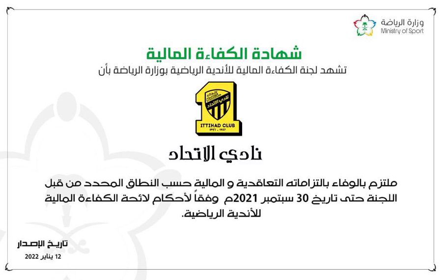 أعلن نادي اتحاد جدة، حصوله على شهادة الكفاءة المالية بشكل رسمي، اليوم الأربعاء الموافق الثاني عشر من شهر يناير الجاري، التي تمكنه من قيد اللاعبين خلال فترة الانتقالات الشتوية الحالية.