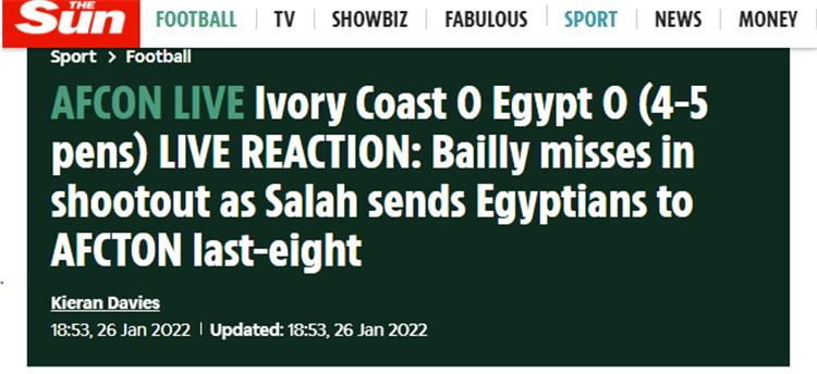 وقال ‏جريدة “ذا صن” الإنجليزية: “بايلي يهدر في ركلات الترجيح وصلاح يرسل المصريين إلى دور الثمانية في أمم إفريقيا”.