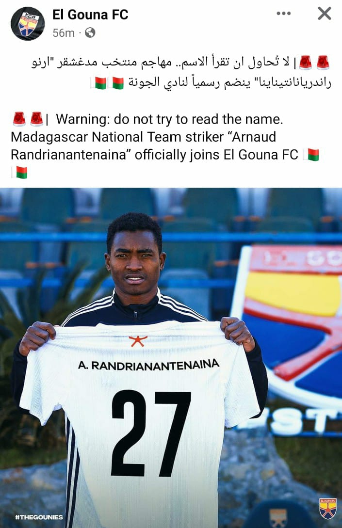 وسخر الحساب الرسمي لنادي الجونة عبر موقع التواصل الاجتماعي “فيس بوك” من اسم لاعبه الجديد، وكتب “لا تُحاول أن تقرأ الاسم، مهاجم منتخب مدغشقر “أرنو راندريانانتيناينا” ينضم رسمياً لنادي الجونة”.