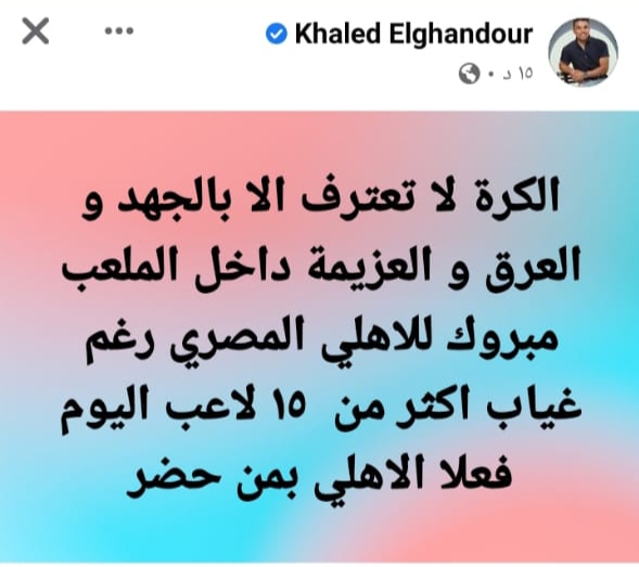 وكتب الغندور عبر حسابه على موقع “فيس بوك”: “الكرة لا تعترف إلا بالجهد والعرق والعزيمة داخل الملعب مبروك للأهلي المصري رغم غياب أكثر من 15 لاعب اليوم فعلاً الاهلي بمن حضر”.
