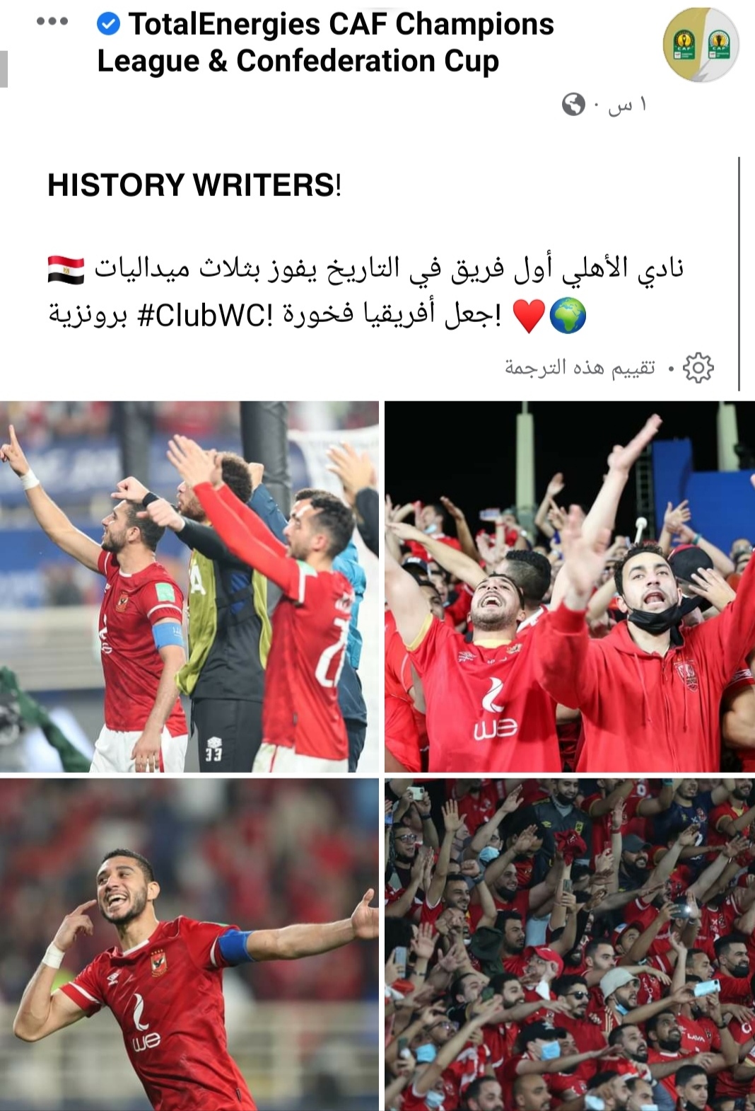 وكتب الحساب الرسمي للاتحاد الافريقي لكرة القدم كاف عبر موقع التواصل الاجتماعي “فيس بوك”: “النادي الأهلي أول فريق في التاريخ يفوز بثلاث ميداليات”.