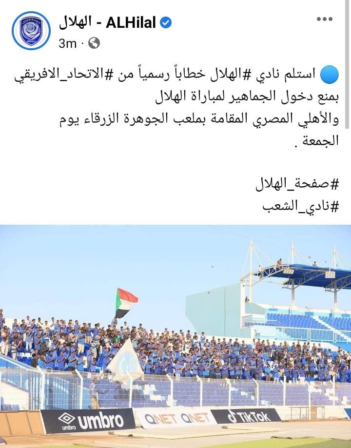 وأعلن نادي الهلال السوداني عبر حسابه الرسمي على فيس بوك أنه تلقى إخطارًا رسميًا من كاف مساء اليوم، يخطره من خلال بعدم وجود حضور جماهيري في مباراة الأهلي.