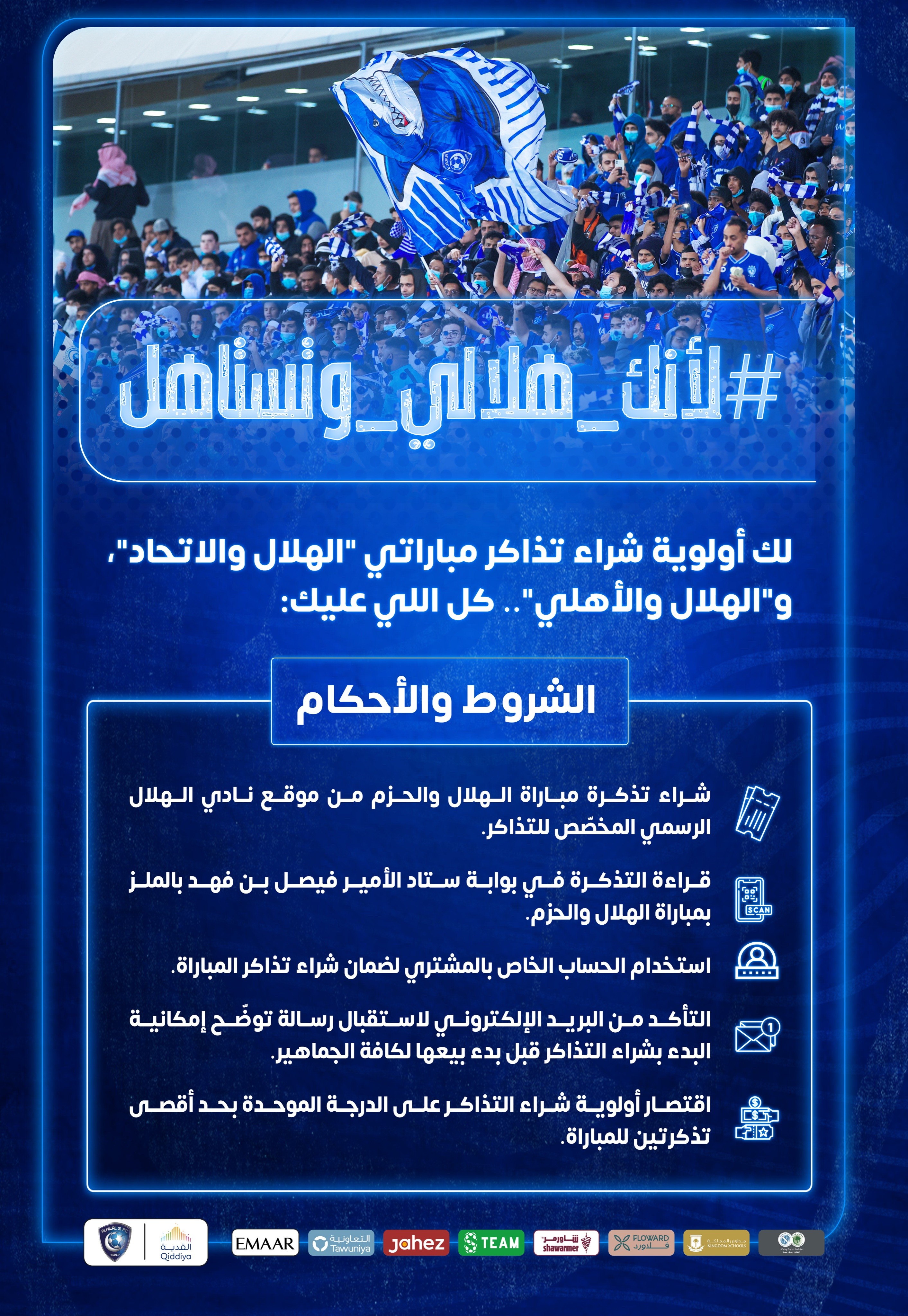 وكتب الحساب الرسمي لنادي الهلال عبر موقع التواصل الاجتماعي “تويتر” مساء اليوم الخميس: “لأنك هلالي وتستاهل، اشتر تذاكر مباراة الهلال والحزم، ولك أولوية شراء تذاكر مباراتي “الهلال والاتحاد”، و”الهلال والأهلي”.