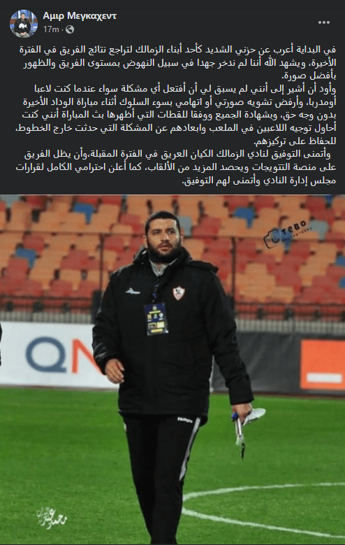 وكتب أمير عبر حسابه الشخصي في موقع “فيس بوك”: “في البداية أعرب عن حزني الشديد كأحد أبناء الزمالك لتراجع نتائج الفريق في الفترة الأخيرة، ويشهد الله أننا لم ندخر جهدًا في سبيل النهوض بمستوى الفريق والظهور بأفضل صورة”.