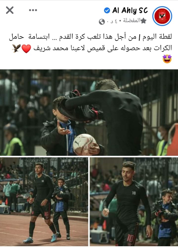 وعلق النادي الأهلي عبر حسابه الرسمي على موقع التواصل الاجتماعي “فيسبوك”، ” لقطة اليوم | من أجل هذا تلعب كرة القدم … ابتسامة حامل الكرات بعد حصوله على قميص لاعبنا محمد شريف”.