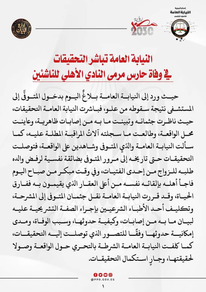 وتباشر النيابة العامة التحقيقات في وفاة حارس مرمى النادي الأهلي للناشئين، وبينت التحقيقات ما به من إصابات ظاهرية، وعاينت محل الواقعة، وطالعت ما سجلته آلاتُ المراقبة المطلة عليه.