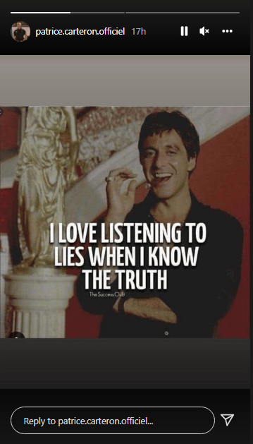 وكتب كارتيرون عبر حسابه على “إنستجرام”: “أحب الاستماع إلى الأكاذيب عندما أكون على علم بالحقيقة”.