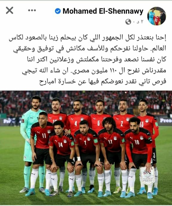 وكتب الشناوي عبر حسابه الرسمي بموقع التواصل الاجتماعي “فيس بوك”: “إحنا بنعتذر لكل الجمهور اللي كان بيحلم زينا بالصعود لكأس العالم”.