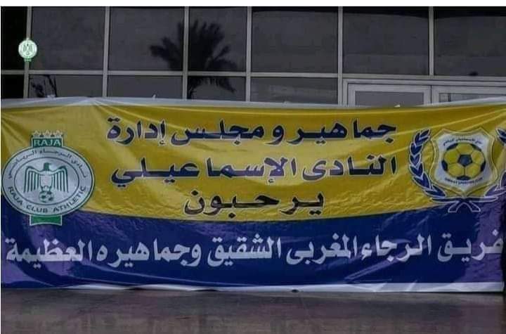 ورفعت جماهير الدراويش لافتة وعلقت عليها: “جماهير ومجلس إدارة النادي الإسماعيلي يرحبون بفريق الرجاء المغربي الشقيق وجماهيره العظيمة”.