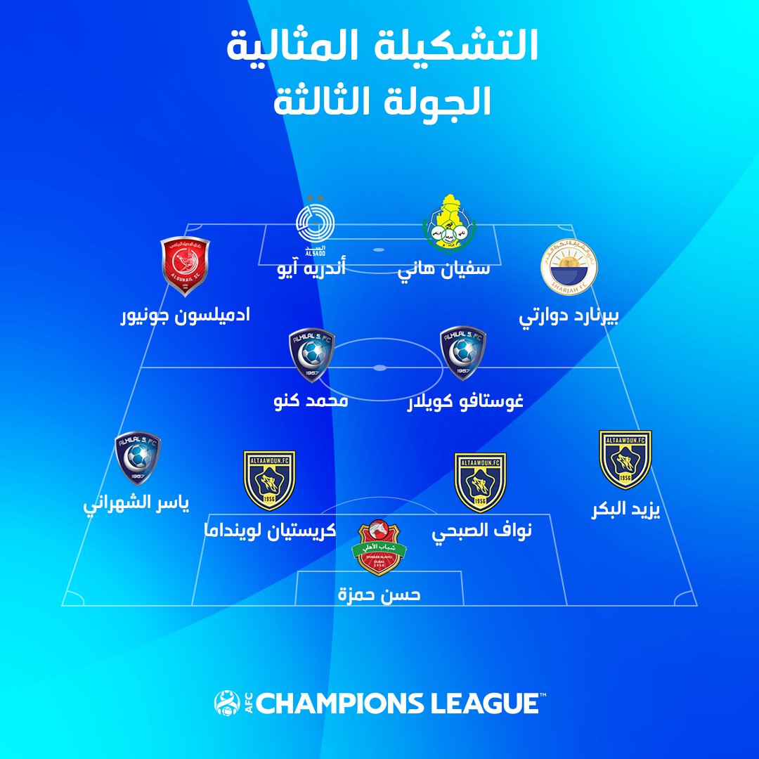 وشهد التشكيل المثالي في الجولة الثالثة من منافسات دوري أبطال آسيا تواجد، ثلاثي الهلال وهم “جوستافو كويلار، محمد كنو، وياسر الشهراني”، بالإضافة إلى ثلاثي التعاون يزيد البكر، ونواف الصبحي، وكريستيان لوينداما”.
