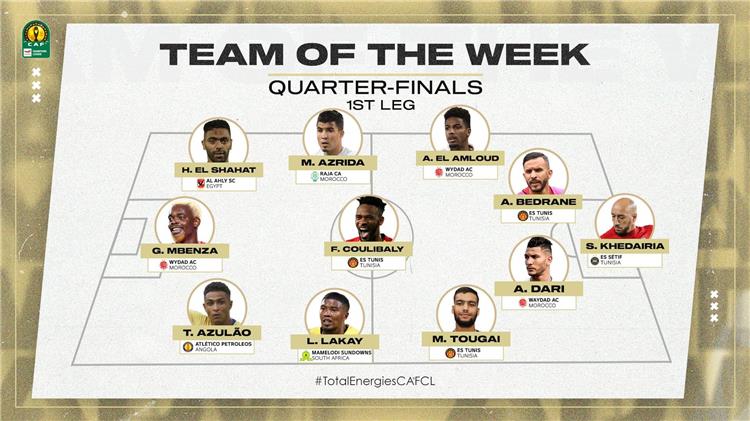 كشف الاتحاد الأفريقي لكرة القدم «كاف» عن التشكيل المثالي لجولة الذهاب من الدور ربع النهائي من بطولة دوري أبطال أفريقيا.