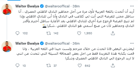 وواصل: “ليعذرني البعض فأنا اتحدث من خلال مترجم ولست جيدًا في اللغة العربية، وأنا قمت بكتابة هذه التغريدة فقط من أجل بعض الصحافة السيئة التي تتحدث عن انني لا أريد الرجوع إلى النادي الاهلي المصري وشكرًا”.