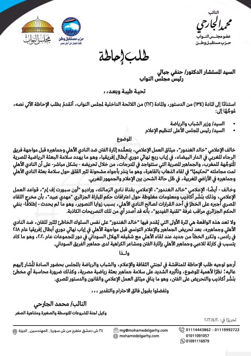 تقدم محمد الجارحي عضو مجلس إدارة النادي الأهلي ومجلس الشعب بطلب إحاطة في الساعات القليلة الماضية إلى الدكتور حنفي الجبالي رئيس مجلس النواب نظراً لما يقوم به الإعلامي خالد الغندور بتعمد إثارة الفني ضد النادي الأهلي وجماهير قبل مواجهة فريق الرجاء البيضاوي وفقاً لما ذكره في خطابه.