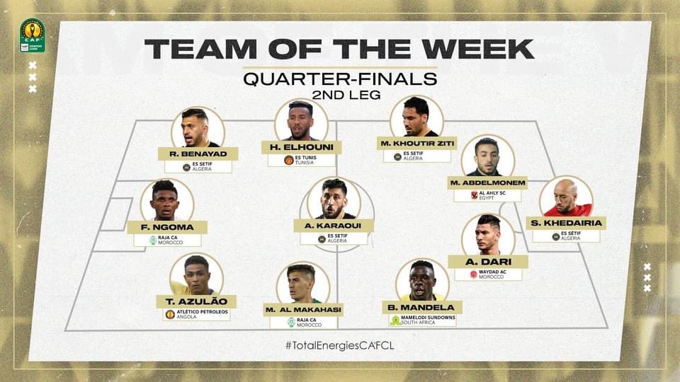 كشف الاتحاد الأفريقي لكرة القدم «كاف» عن التشكيل المثالي لجولة الإياب من الدور ربع النهائي من بطولة دوري أبطال أفريقيا.
