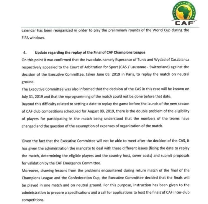 الفقرة الأخيرة للبند الرابع تنص على إقامة نهائيات دوري أبطال إفريقيا فيما بعد عام 2019، بنظام المباراة الواحدة وفي أرض محايدة.