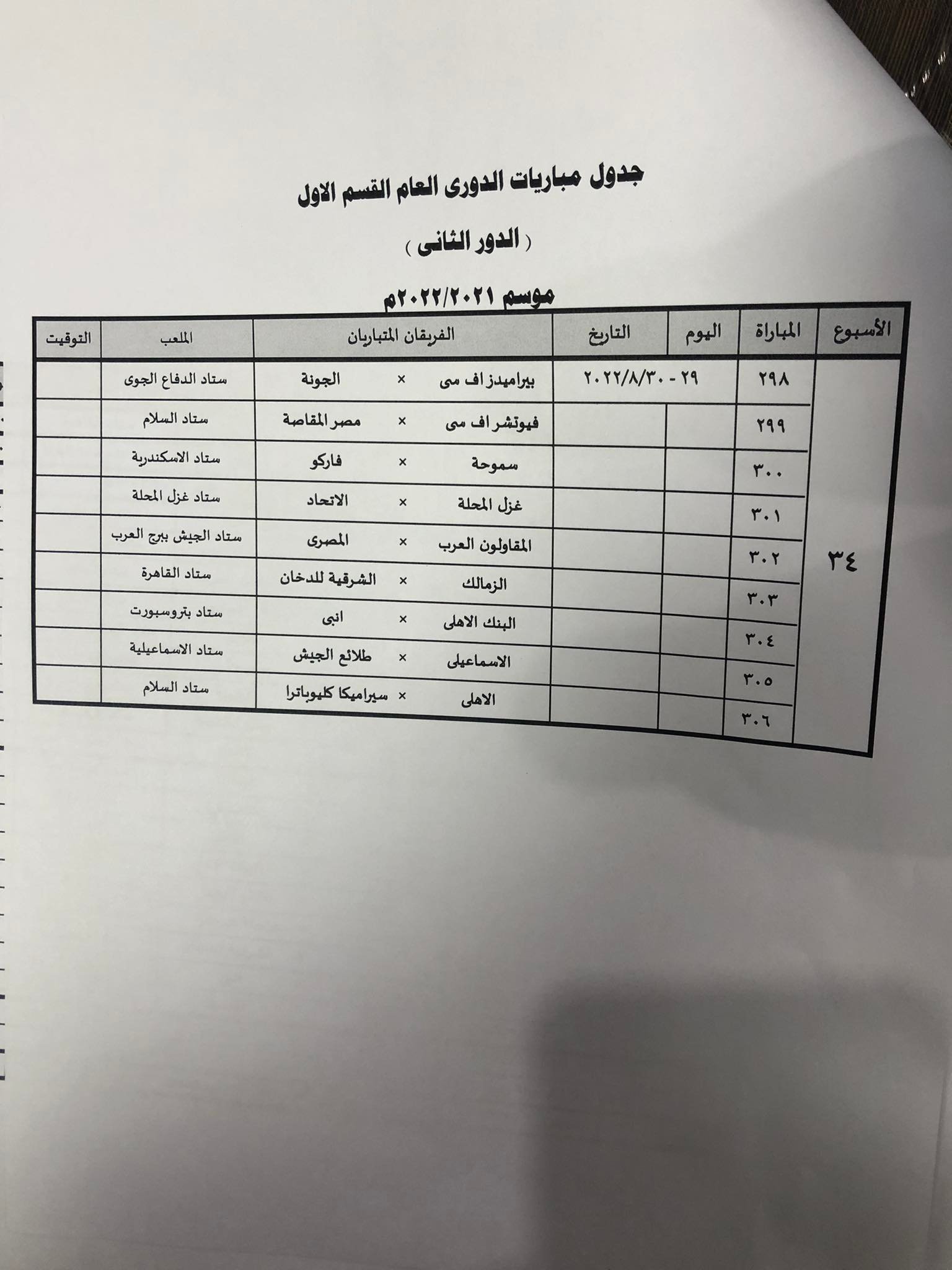 وجاء جدول مباريات الدوري على النحو التالي: