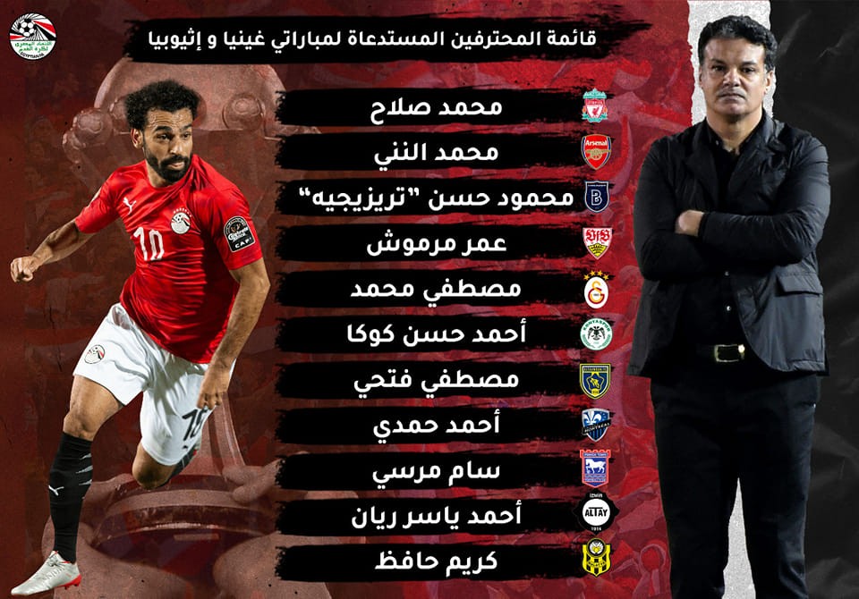أعلن إيهاب جلال، المدير  الفني لمنتخب مصر الأول، القائمة المبدئية لأسماء اللاعبين المحترفين بالخارج استعدادا لمعسكر مباراتي غينيا وإثيوبيا.