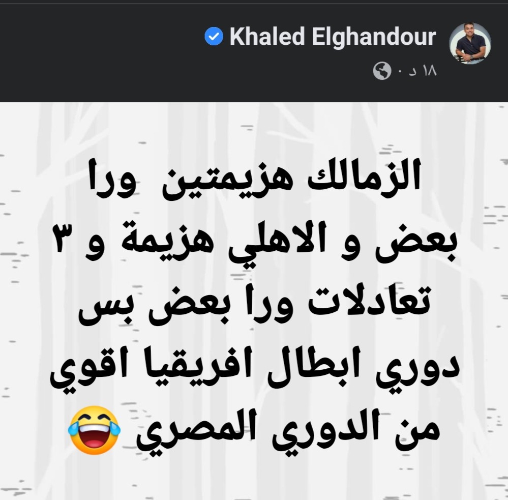 وكتب الغندور عبر حسابه الشخصي في موقع التواصل الاجتماعي «فيس بوك»: “الزمالك هزيمتين ورا بعض والأهلي هزيمة و٣ تعادلات ورا بعض بس دوري أبطال أفريقيا أقوى من الدوري المصري”.
