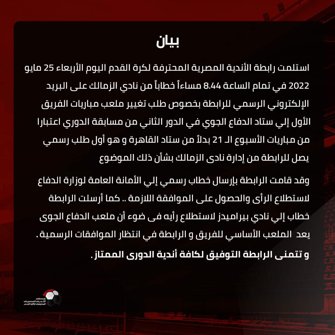 وأبدى الزمالك اندهاشه من موقف بعض الأشخاص الغريب وغير المفهوم بترديدهم أن النادي لم يخاطب رابطة الأندية من أجل نقل مبارياته في الدور الثاني من بطولة الدوري الممتاز للموسم الحالي 2021-2022، وكذلك بطولة كأس مصر من استاد القاهرة إلى ملعب الدفاع الجوي.