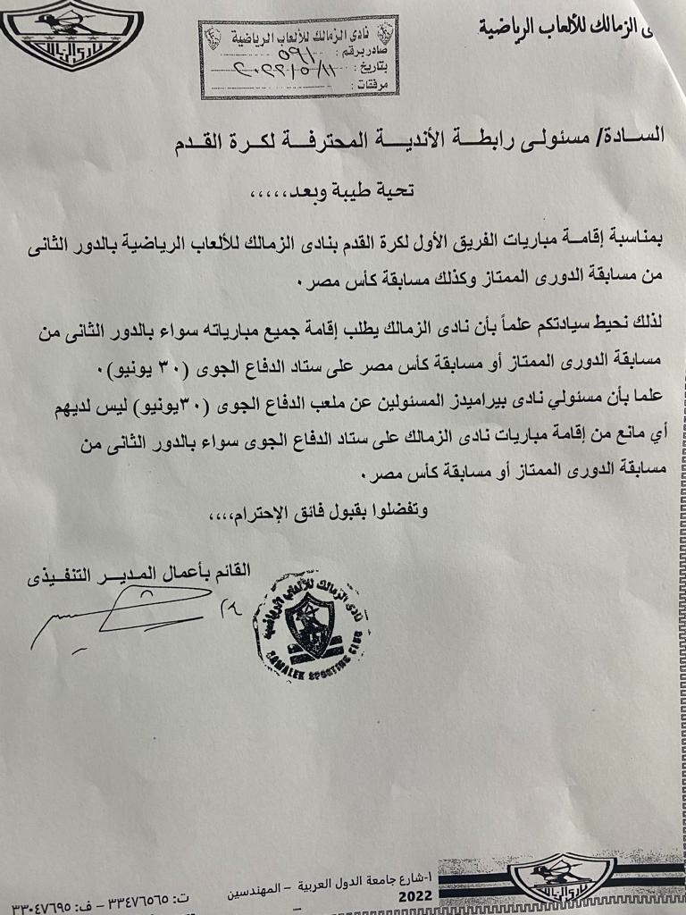ونشر الموقع الرسمي لنادي الزمالك صورة الخطاب المرسل إلى رابطة الأندية للمحترفين، لطلب نقل مبارياته إلى ملعب الدفاع الجوي، عبر موقعه الرسمي.