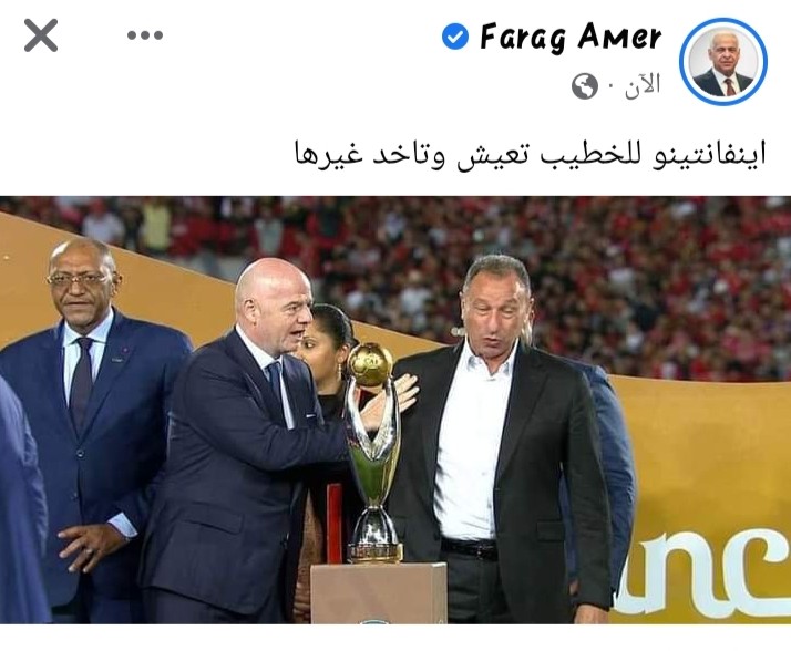 وكتب فرج عامر عبر حسابه الرسمي على موقع التواصل الاجتماعي فيسبوك، معلقًا على صورة محمود الخطيب رئيس النادي الأهلي، وجياني انفانتينو، رئيس الاتحاد الدولي لكرة القدم “فيفا”، أثناء تسليم الميدليات في نهائي دوري أبطال إفريقيا، “اينفانتينو للخطيب تعيش وتاخد غيرها”.