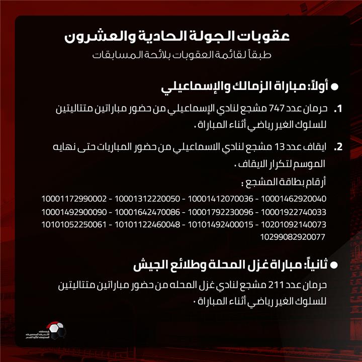 كما قرر إيقاف عدد 13 مشجع لنادي الإسماعيلي من حضور المباريات حتى نهاية الموسم بسبب تكرار الإيقاف.