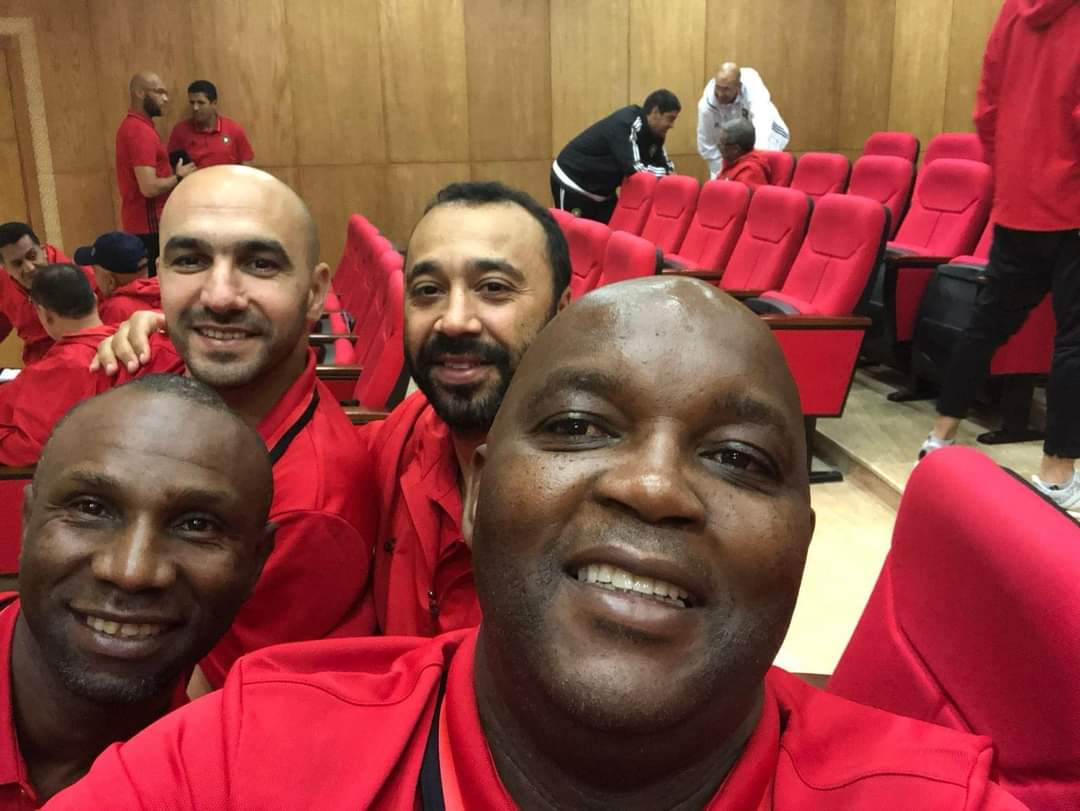 ظهر الجنوب أفريقي بيتسو موسيماني، المدير الفني للفريق الأول لكرة القدم بالنادي الأهلي، مع وليد الركراكي، المدير الفني للوداد المغربي، في دورة فيفا بالمغرب.