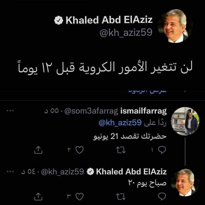 وكتب خالد عبد العزيز عبر حسابه الرسمي بموقع التواصل الإجتماعي “تويتر”: “لن تتغير الأمور الكروية قبل 12 يومًا”.