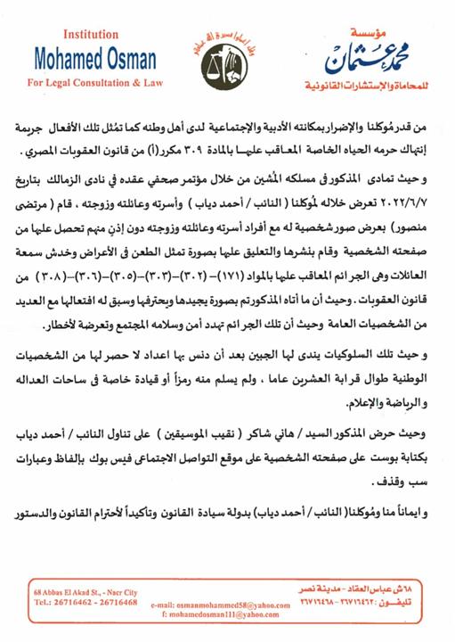 وأعلن محمد عثمان محامي أحمد دياب، اليوم عن تقدمه ببلاغ في بيان رسمي جاء نصه على النحو التالي:-